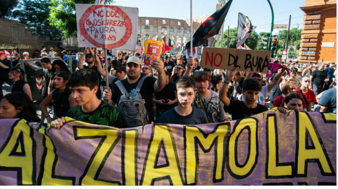 C’È LA CGIL, la Fiom e la Flai. E si capisce che per il sindacato come per molte delle organizzazioni più radicate non è uno sforzo da poco, visto che l’appuntamento romano non ha fermato lo sforzo di mobilitazione nei territori per la campagna referendaria. «Il decreto sicurezza è un provvedimento repressivo, che limita la libertà di poter manifestare e scioperare a tutela dei propri diritti. Noi siamo in piazza per difendere il diritto democratico e costituzionale di manifestare», sostiene Michele De Palma, segretario generale Fiom. Per il Pd c’è una delegazione capitanata dal capogruppo al senato Francesco Boccia. «Manifestiamo contro un decreto pericoloso – dice Boccia – È un’operazione di propaganda per coprire le divisioni nella maggioranza sul ddl su cui il parlamento stava lavorando da 14 mesi. Non ho mai visto risolvere il problema della sicurezza con il carcere per i bambini come prevede questo decreto».