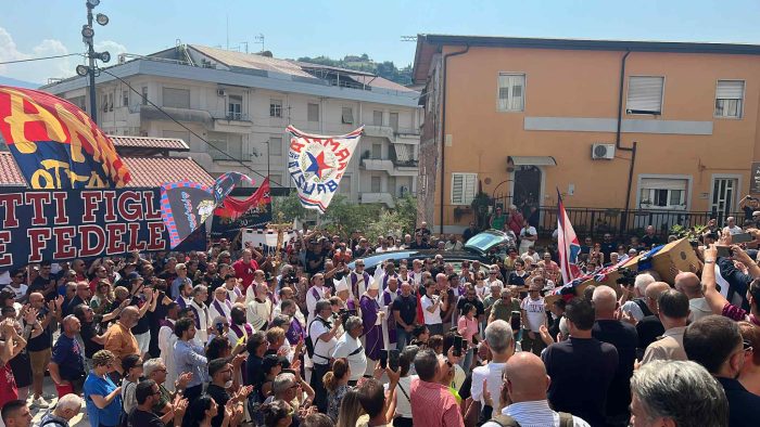 In tanti non entrano nemmeno in chiesa, nauseati dal trattamento che la diocesi di Cosenza e l’Ordine dei Cappuccini hanno riservato a Padre Fedele, nessuno o quasi ascolta l’omelia del padre provinciale Giovanni Loria. Finalmente esce la bara, che è umile quanto lo è stato il Monaco: una bara da ultimi. Dagli altoparlanti del Crocifisso risuonano le note di “Magico Cosenza”, l’inno storico del Cosenza Calcio. Lo cantano tutti i gruppi ultrà, davanti ai quali si sistemano i Cappuccini ma soprattutto Teresa Boero, la collaboratrice storica di Padre Fedele, che gli è rimasta a fianco fino all’ultimo respiro. Poi parte la fatidica “Maracanà” lanciata da Canaletta. Il funerale religioso finisce qui. Allo stadio l’ultimo atto, il funerale ultrà, con gli elogi funebri di Claudio Dionesalvi e Sergio Crocco. Di seguito, quello di Claudio.