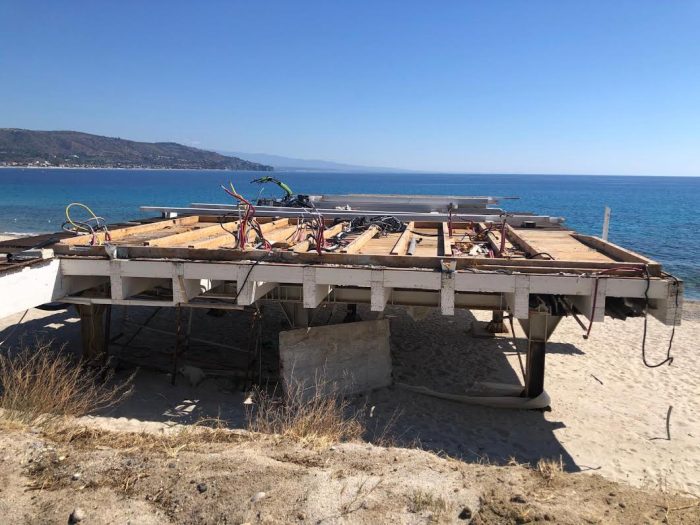 Dunque, abbiamo deciso di inviare un esposto a tutti gli Enti che hanno responsabilità dirette e indirette sulle autorizzazioni concesse per una struttura a pochissimi metri dal mare e dalla necropoli preellenica a Grotticelle, affatto amovibile, fissata sulla cava romana con plinti in cemento armato di un metro cubo ciascuno e oggi anche pericolosa.