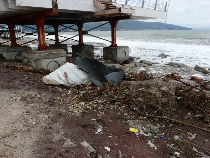 Durante lo smontaggio parziale della struttura, infatti, non vi è stato da parte del proprietario e/o degli operai che hanno eseguito i lavori, alcuna attenzione e tantissimi chiodi e viti, comprese le tegole bituminose, erano sparsi sotto e nei dintorni del lido. La tempesta di vento giunta poco dopo ha fatto il resto spargendo le tegole sulla spiaggia e in mare e ricoprendo tutto di sabbia.