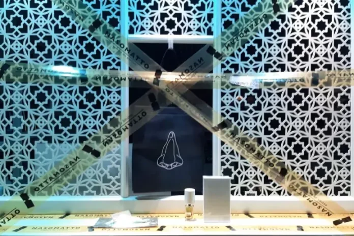Invero l’allestimento era evidentemente funzionale a pubblicizzare un prodotto di nicchia, venduto dalla suindicata profumeria. La signora Scaturchio però aveva intenzionalmente delimitato l’ambiente con dello scotch di colore giallo, a significare palesemente che quello era una ‘scena del crimine’: sicché, per inequivoci segni visivi, si era sostanzialmente voluto affermare ‘non drogatevi, ma lasciatevi inebriare dai miei profumi’.