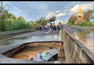 Il cedimento ha provocato la chiusura della strada, arteria strategica perché collega il capoluogo regionale con la stazione ferroviaria e l’aeroporto internazionale di Lamezia Terme, che funziona regolarmente.
