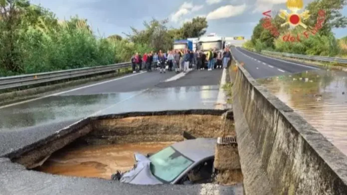 Statale 280 dei Due Mari, Lamezia Terme, Calabria, Italia. Mentre il nostro ministro dei Trasporti – l’irreprensibile e sempre attento #MatteoSalvini – va sul Tg 1 a spese nostre per fare interviste-comizi contro magistrati e migranti (o gioisce per la morte di un uomo) e la sua maggioranza di governo eversiva prova a violentare la Costituzione, il nostro sistema viario annega. Letteralmente. Per fortuna i passeggeri della vettura che vedete in foto sono salvi. Per nostra sfortuna, invece, Salvini continuerà a bofonchiare che avremo il Ponte sullo Stretto. Lui sì che è del mestiere.