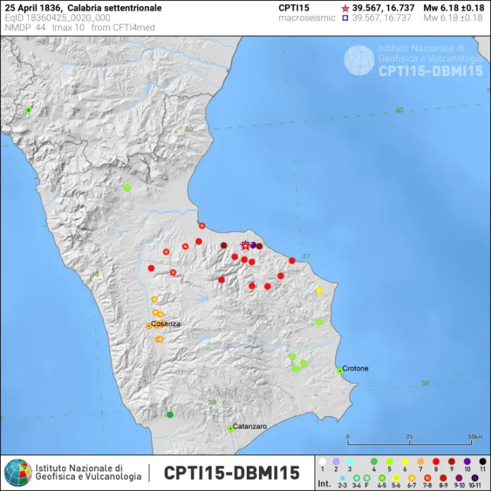 Storicamente nell’area si è verificato il 25 aprile 1836 un forte terremoto di magnitudo stimata pari a 6.2 che ha provocato danni in molte località fino al X grado della scala MCS nella località di Crosia (CS). Dalla mappa si evince un risentimento in un’area molto vasta della Calabria in modo analogo a quanto avvenuto con l’evento odierno.