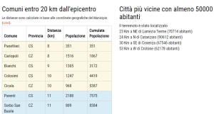 Una scossa di terremoto si è verificata alle 00:09 in Sila e precisamente tra Ciricilla e Villaggio Mancuso con epicentro a 8 km a NordEst da Panettieri (Cosenza). Il sisma, di magnitudo 3.1, con coordinate geografiche (lat, lon) 39.114, 16.518 ad, è stato nettamente avvertito dalla popolazione essendosi verificato ad una profondità di 8.9 chilometri. Il terremoto è stato localizzato da: Sala Sismica INGV-Roma. Non si segnalano danni a persone o cose.