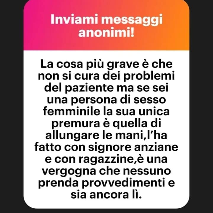 Un collettivo femminile cosentino, Gynestra, operativo sul Tirreno Cosentino, sulla pagina social della community, ha aperto un box anonimo di denuncia e sono state decine le segnalazioni che hanno riguardato un medico della Guardia medica della zona. I racconti delle donne, sostanzialmente simili, parlano di un medico che allunga le mani «anche se vai per un dolore al piede», che fa «allusioni sessuali indifferentemente a giovani donne o anziane» e che «richiede test di gravidanza in loco anche a donne evidentemente in menopausa e che si recano lì per problemi non ginecologici». I messaggi sono stati ripresi dal collettivo femminile Fem.In cosentine in lotta, che da anni si batte per aiutare le donne nei percorsi di denuncia contro ogni tipo di abuso. Al momento non risulta che siano state presentate denunce alle forze dell’ordine ma, secondo quanto si è appreso, a breve dovrebbero comunque essere avviati accertamenti.