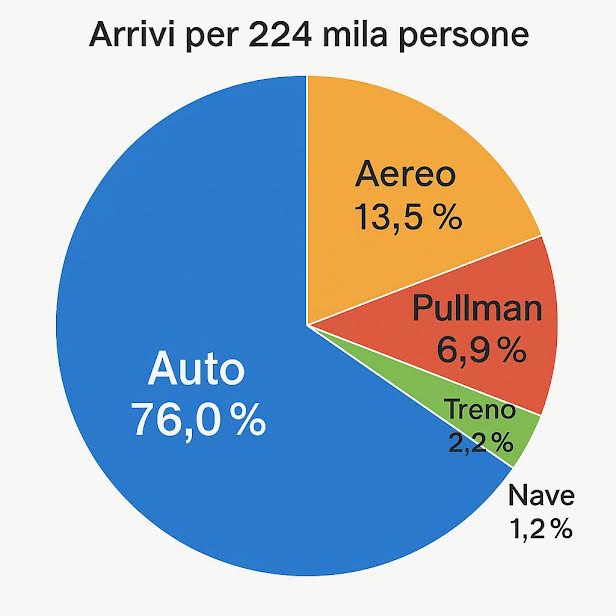 Ma alla fine è lo stesso rapporto della Regione che ammette che i turisti in Calabria continuano ad arrivare con l’auto propria. Distribuzione dei mezzi di trasporto: “L’analisi dei mezzi di trasporto utilizzati per raggiungere la Calabria nel primo trimestre 2025, normalizzata su scala logaritmica, evidenzia una netta prevalenza dell’auto privata (1,87), seguita dall’aereo (1,12). Gli altri mezzi risultano meno significativi: pullman o altro mezzo stradale (0,83), treno (0,34) e nave (0,08)”. Per capire cosa sia la scala logaritmica e tradurla in percentuale ci ho messo una giornata. In pratica abbiamo avuto che su 224.000 arrivi, 170.292 pari al 76% hanno viaggiato in auto, 30.295 pari al 13,5% sono arrivati in aereo, 15.544 pari al 6,9 sono arrivati in pullman, 5.034 pari al 2,2% sono arrivati in treno e 2.764 pari all’1,2% in nave…