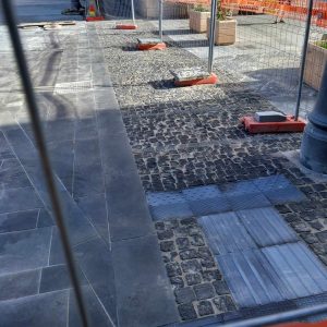 La piazza sarà transitabile dai veicoli, per cui spero che al contrario che in passato, qualcuno tra le decine di tecnici i cui nomi compaiono bellamente nelle tabelle cantiere (dove esposte), si sia preso la briga di verificare nei capitolati e sul cantiere che le basole utilizzate abbiano uno spessore che sopporti un carico adeguato, quindi non di 5 cm (come mi è parso che siano), bensì come regolamentato; diversamente, come in piazza S.Leoluca, polvere nera erano e polvere nera ritorneranno.