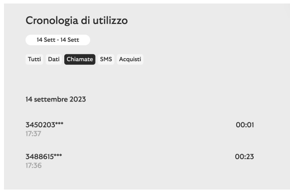 Si allega a tal fine alla presente dettaglio spese del numero indicato relativo ai giorni 14/09/2023 e 15/09/2023 – contenente numeri chiamati, data e ora e durata della chiamata – estratto dall’account personale del sig. GIULIANO Tonycristian, per acclarare quanto indicato.